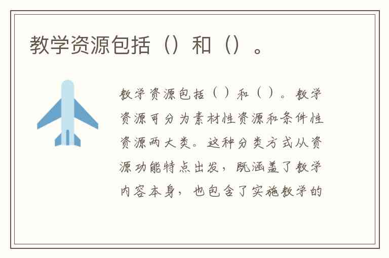 教学资源可分为素材性资源和条件性资源两大类。这种分类方式从资源功能特点出发,既涵盖了教学内容本身,也包含了实施教学的必要支撑条件。