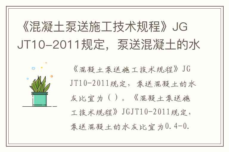 工程实践中,需结合具体材料特性和泵送距离动态调整。例如,当泵送高度超过100米或距离超过300米时,建议将水灰比控制在0.45-0.55范围内,并通过试泵验证混凝土的流动性和保水性。你在实际施工中是否遇到过因水灰比控制不当导致的泵送问题?