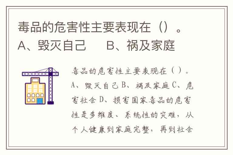 毒品的危害性是多维度、系统性的灾难,从个人健康到家庭完整,再到社会稳定与国家发展,均会造成毁灭性打击。毁灭自己、祸及家庭、危害社会、损害国家这四个选项全面概括了其危害本质。