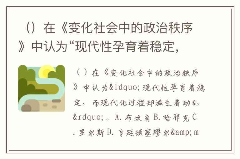 ()在《变化社会中的政治秩序》中认为“现代性孕育着稳定,而现代化过程却滋生着动乱”。A.布坎南 B.哈耶克 C.罗尔斯 D.亨廷顿