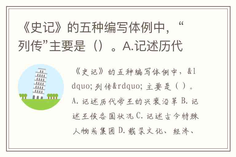 《史记》的五种编写体例中,“列传”主要是()。A.记述历代帝王的兴衰沿革 B.记述王侯各国状况 C.记述古今特殊人物或集团 D.载录文化、经济、制度
