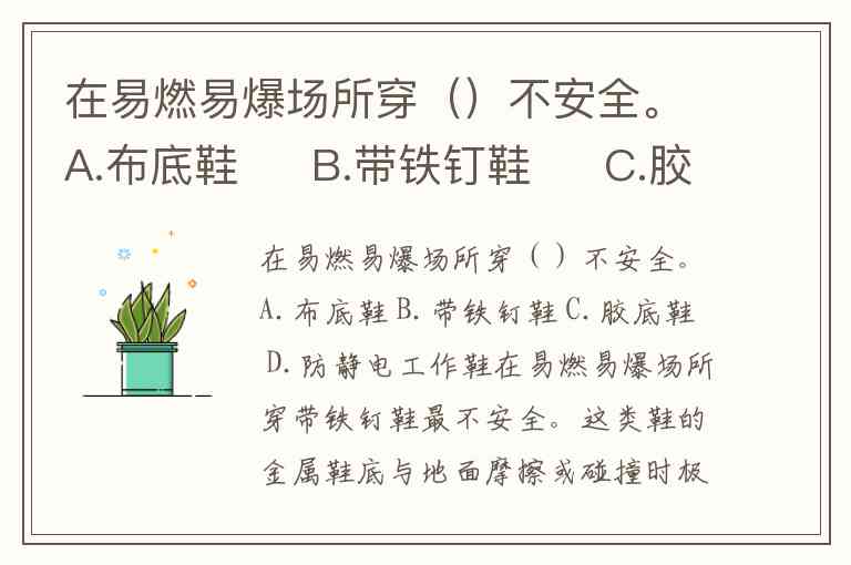 在易燃易爆场所穿()不安全。A.布底鞋 B.带铁钉鞋 C.胶底鞋 D.防静电工作鞋