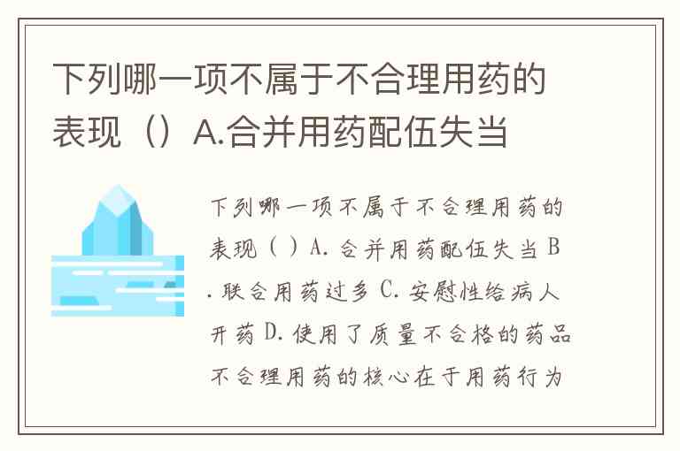 下列哪一项不属于不合理用药的表现()A.合并用药配伍失当 B.联合用药过多 C.安慰性给病人开药 D.使用了质量不合格的药品