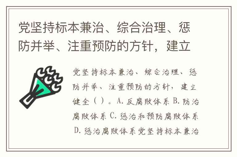 党坚持标本兼治、综合治理、惩防并举、注重预防的方针,建立健全()。A.反腐败体系 B.防治腐败体系 C.惩治和预防腐败体系 D.惩治腐败体系