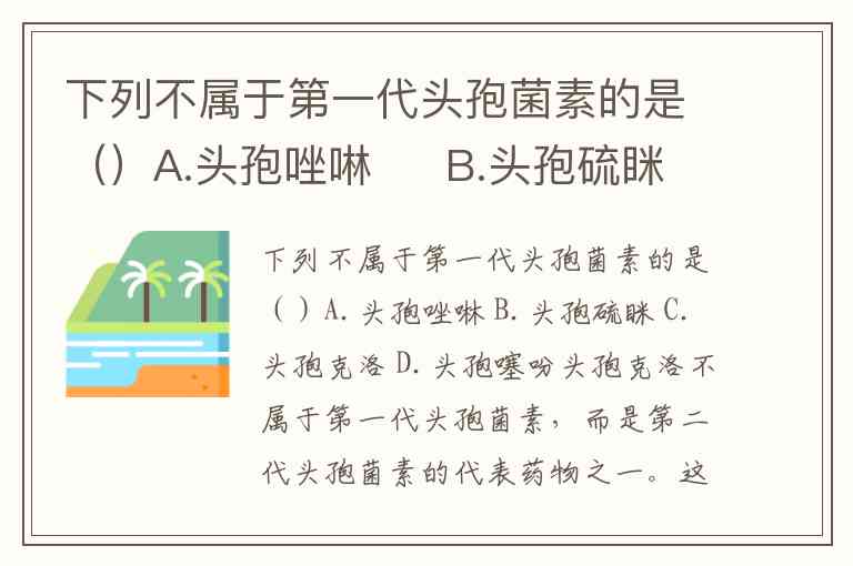 下列不属于第一代头孢菌素的是()A.头孢唑啉 B.头孢硫眯 C.头孢克洛 D.头孢噻吩