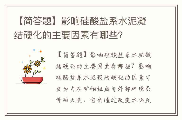 影响硅酸盐系水泥凝结硬化的因素可分为内在矿物组成与外部环境条件两大类,它们通过改变水化反应速率和产物结构共同决定硬化特性。