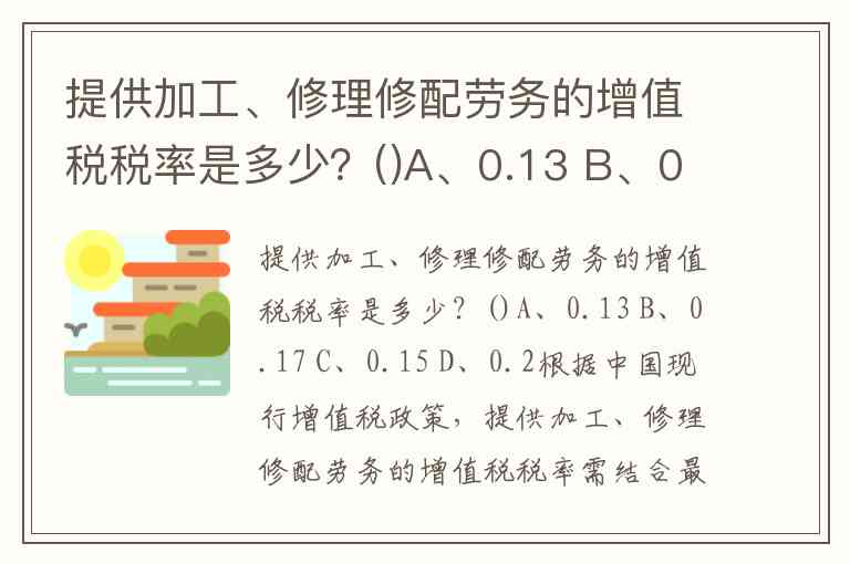 提供加工、修理修配劳务的增值税税率是多少?()A、0.13 B、0.17 C、0.15 D、0.2