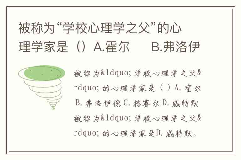 被称为“学校心理学之父”的心理学家是()A.霍尔 B.弗洛伊德 C.格赛尔 D.威特默
