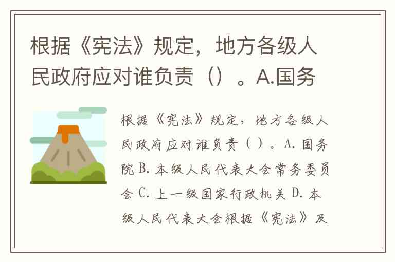 根据《宪法》规定,地方各级人民政府应对谁负责()。A.国务院 B.本级人民代表大会常务委员会 C.上一级国家行政机关 D.本级人民代表大会