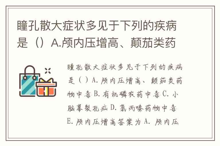 瞳孔散大症状多见于下列的疾病是()A.颅内压增高、颠茄类药物中毒 B.有机磷农药中毒 C.小脑幕裂孔疝 D.氯丙嗪药物中毒 E.颅内压增高