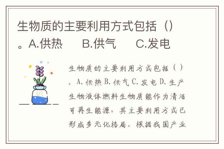 生物质的主要利用方式包括()。A.供热 B.供气 C.发电 D.生产生物液体燃料