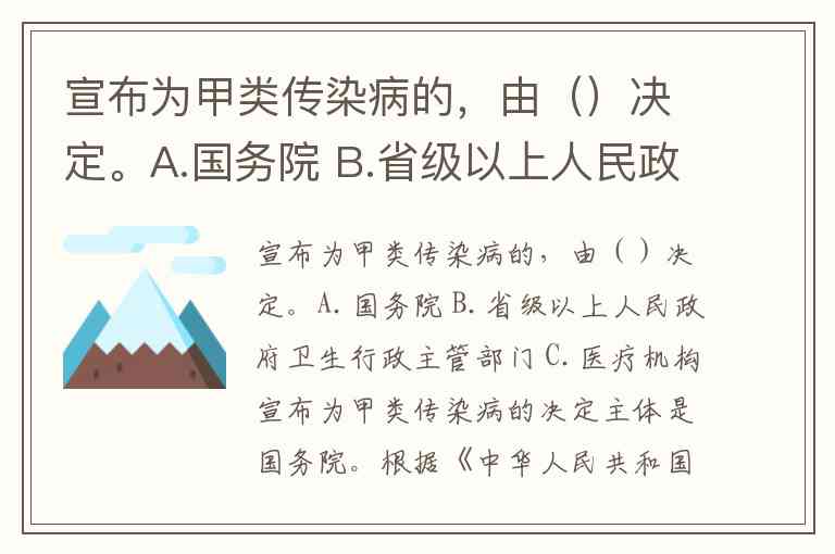 宣布为甲类传染病的,由()决定。A.国务院 B.省级以上人民政府卫生行政主管部门 C.医疗机构