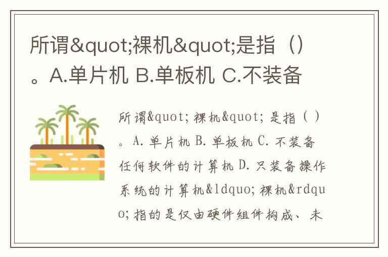 所谓"裸机"是指()。A.单片机 B.单板机 C.不装备任何软件的计算机 D.只装备操作系统的计算机