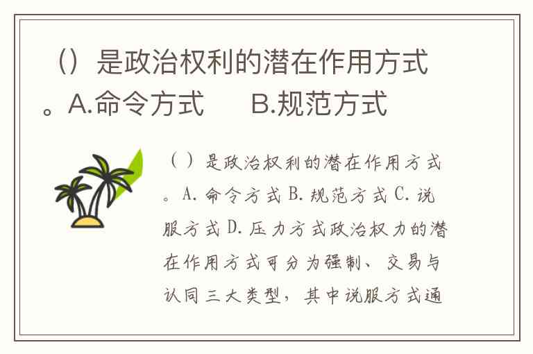 ()是政治权利的潜在作用方式。A.命令方式 B.规范方式 C.说服方式 D.压力方式