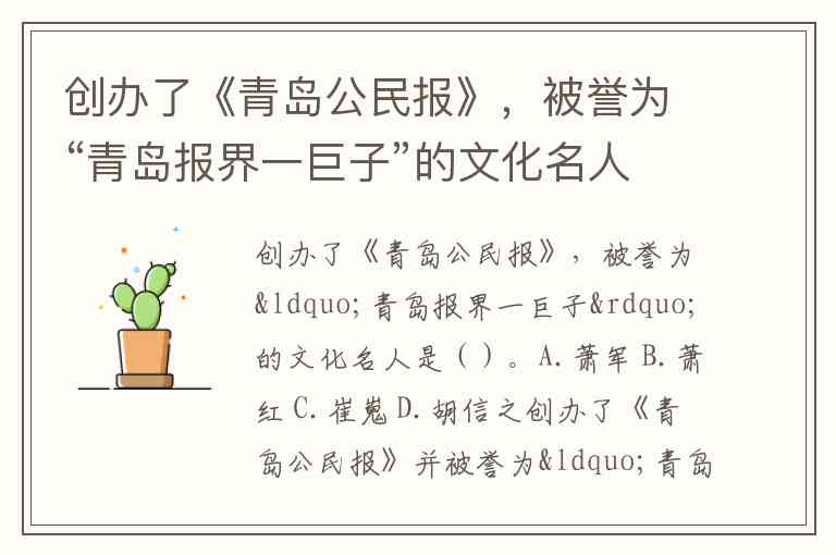 创办了《青岛公民报》,被誉为“青岛报界一巨子”的文化名人是()。A.萧军 B.萧红 C.崔嵬 D.胡信之