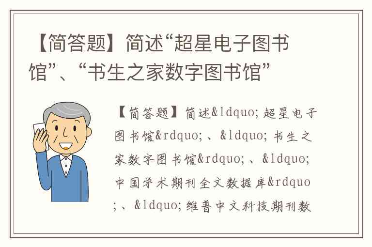 【简答题】简述“超星电子图书馆”、“书生之家数字图书馆”、“中国学术期刊全文数据库”、“维普中文科技期刊数据库”和“万方数字化期刊”收藏资源的特点。