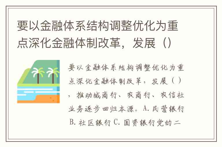 要以金融体系结构调整优化为重点深化金融体制改革,发展(),推动城商行、农商行、农信社业务逐步回归本源。A.民营银行 B.社区银行 C.国资银行