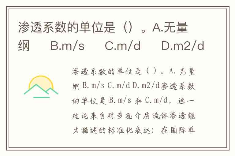 渗透系数的单位是 B.m/s 和 C.m/d。这一结论来自对多孔介质流体渗透能力描述的标准化表达:在国际单位制中,其基本单位为米每秒(m/s),而在工程实践(如地质调查、水文分析)中,米每天(m/d)因更贴合宏观时间尺度而被广泛采用。