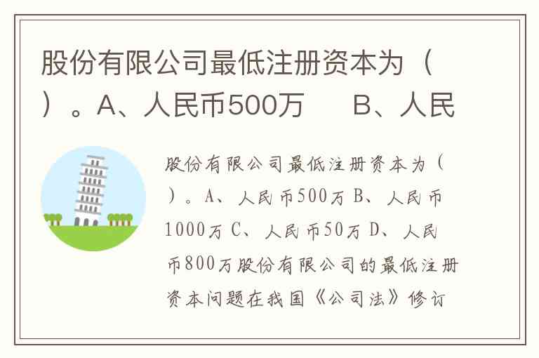 股份有限公司最低注册资本为()。A、人民币500万 B、人民币1000万 C、人民币50万 D、人民币800万