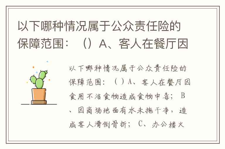 以下哪种情况属于公众责任险的保障范围:()A、客人在餐厅因食用不洁食物造成食物中毒; B、因商场地面有水未拖干净,造成客人滑倒骨折; C、办公楼火灾造成大楼电梯损坏 D、医院医疗事故导致病人死亡