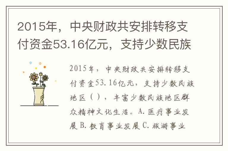 2015年,中央财政共安排转移支付资金53.16亿元,支持少数民族地区(),丰富少数民族地区群众精神文化生活。A.医疗事业发展 B.教育事业发展 C.旅游事业发展 D.文化事业发展