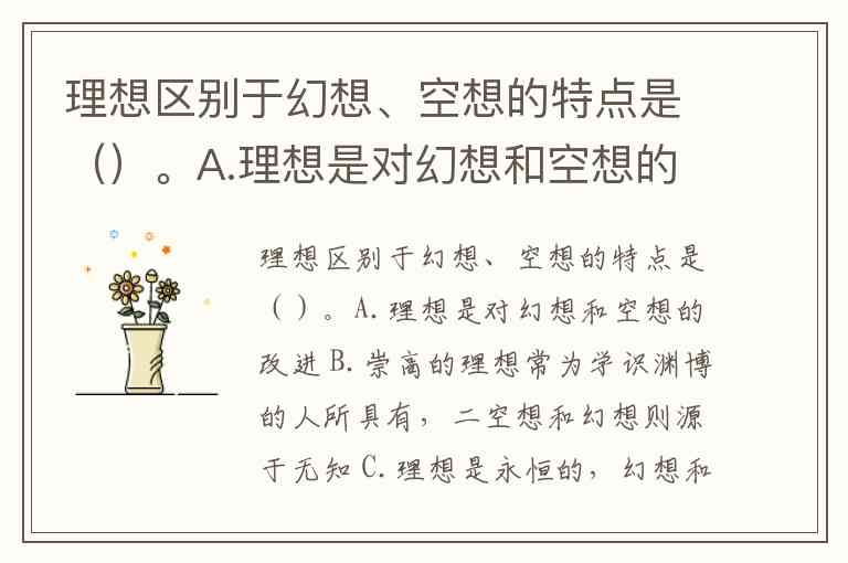 理想区别于幻想、空想的特点是()。A.理想是对幻想和空想的改进 B.崇高的理想常为学识渊博的人所具有,二空想和幻想则源于无知 C.理想是永恒的,幻想和空想可以随时间变化而变化 D.理想源于实践,具有实现可能,是对未来的向往和追求