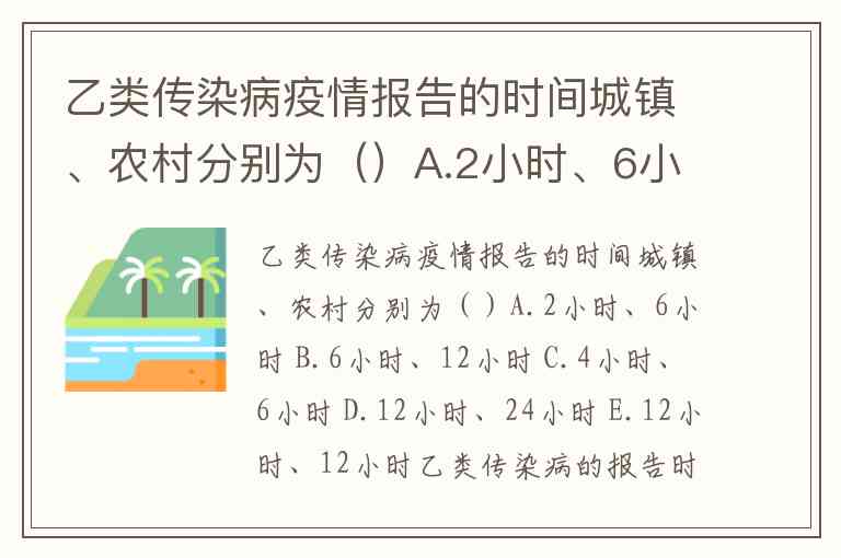 乙类传染病疫情报告的时间城镇、农村分别为()A.2小时、6小时 B.6小时、12小时 C.4小时、6小时 D.12小时、24小时 E.12小时、12小时