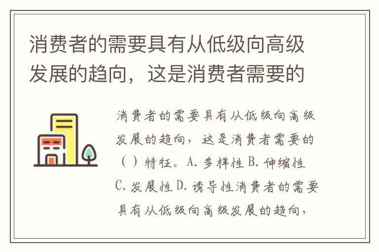 消费者的需要具有从低级向高级发展的趋向,这是消费者需要的()特征。A.多样性 B.伸缩性 C.发展性 D.诱导性