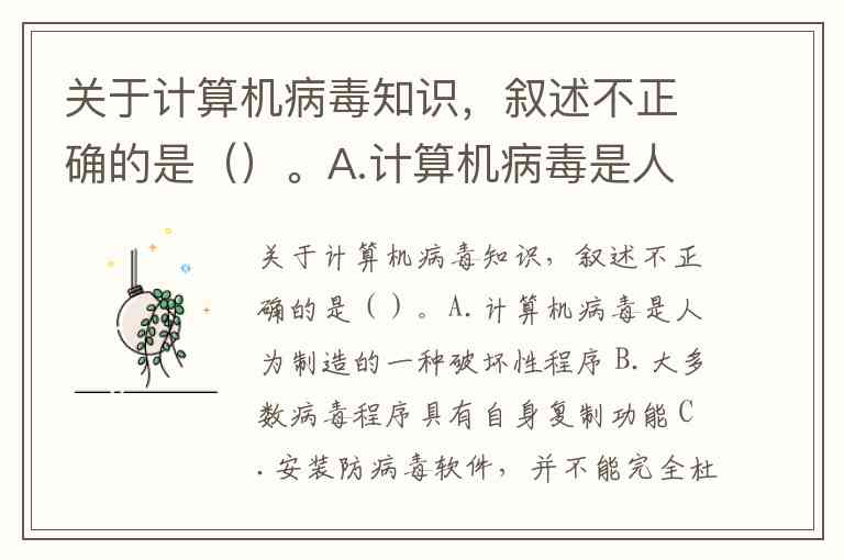 关于计算机病毒知识,叙述不正确的是()。A.计算机病毒是人为制造的一种破坏性程序 B.大多数病毒程序具有自身复制功能 C.安装防病毒软件,并不能完全杜绝病毒的侵入 D.使用来历不明的软件是防止病毒侵入的有效措施