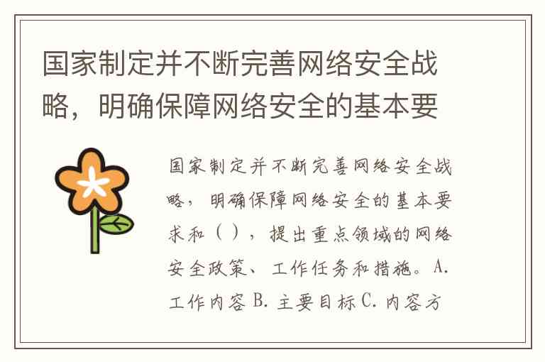 国家制定并不断完善网络安全战略,明确保障网络安全的基本要求和(),提出重点领域的网络安全政策、工作任务和措施。A.工作内容 B.主要目标 C.内容方针 D.战略方向