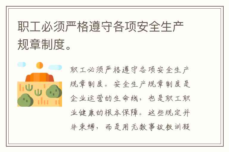 安全生产规章制度是企业运营的生命线,也是职工职业健康的根本保障。这些规定并非束缚,而是用无数事故教训凝结的"安全法典"——从设备操作规程到应急处理流程,从个人防护要求到作业许可管理,每一条款都对应着潜在风险的防控。职工严格遵守这些制度,既是对自身生命负责,也是对同事安全、企业财产和社会稳定的守护。