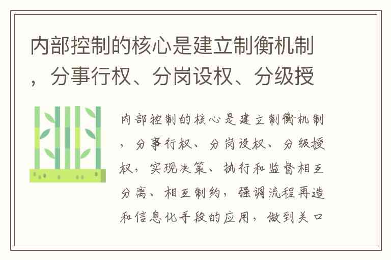 这是内部控制的基础性措施,要求将可能产生舞弊风险的岗位进行分离。例如,同一人不得同时担任业务审批与执行、资产保管与记录等职责,需通过“决策、执行、监督”机构的独立设置形成制约。常山县财政局的制度明确指出,需通过分离措施形成“各司其职、各负其责、横向与纵向相互制约监督的工作机制”,并对关键岗位实行A/B角制度和定期轮岗。这与用户问题中“分岗设权”的核心要求直接对应。