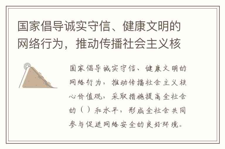 国家倡导诚实守信、健康文明的网络行为,推动传播社会主义核心价值观,采取措施提高全社会的()和水平,形成全社会共同参与促进网络安全的良好环境。A.网络安全意识 B.网络诚信意识 C.网络社会道德意识 D.网络健康意识