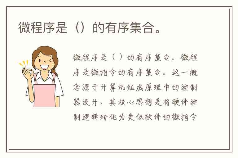 微程序是微指令的有序集合。这一概念源于计算机组成原理中的控制器设计,其核心思想是将硬件控制逻辑转化为类似软件的微指令序列,从而实现机器指令的功能。每条微指令包含若干微命令,这些微命令直接控制CPU内部的微操作,例如数据通路的选通、寄存器的读写等基础动作。