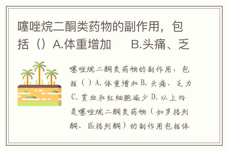 噻唑烷二酮类药物的副作用,包括()A.体重增加 B.头痛、乏力 C.贫血和红细胞减少 D.以上均是