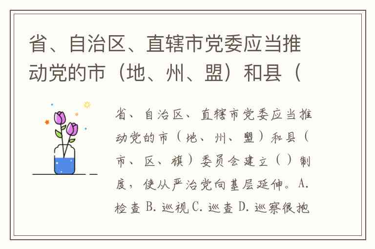 省、自治区、直辖市党委应当推动党的市(地、州、盟)和县(市、区、旗)委员会建立()制度,使从严治党向基层延伸。A.检查 B.巡视 C.巡查 D.巡察