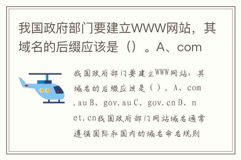 我国政府部门要建立WWW网站,其域名的后缀应该是()。A、com.au B、gov.au C、gov.cn D、net.cn