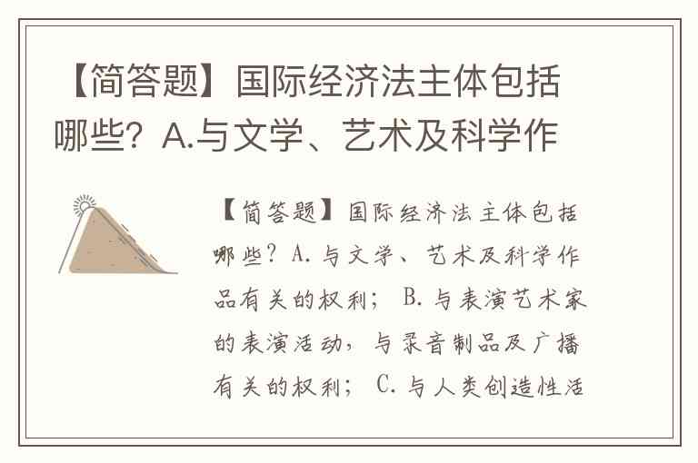 【简答题】国际经济法主体包括哪些?A.与文学、艺术及科学作品有关的权利; B.与表演艺术家的表演活动,与录音制品及广播有关的权利; C.与人类创造性活动的一切领域内的发明有关的权利; D.与科学发现有关的权利;