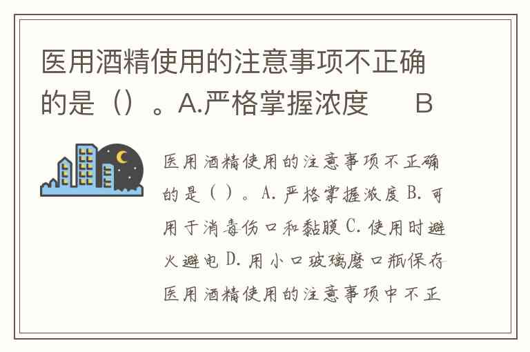 其他选项均为正确操作:A.严格掌握浓度是因为75%酒精杀菌效果最佳,过高浓度会形成蛋白质保护膜阻碍渗透;C.使用时避火避电源于酒精易燃易挥发特性,其蒸气与空气混合可形成爆炸性混合物,需远离明火及电气火花;D.用小口玻璃磨口瓶保存能减少挥发并避光,符合酒精需密封、阴凉保存的要求。