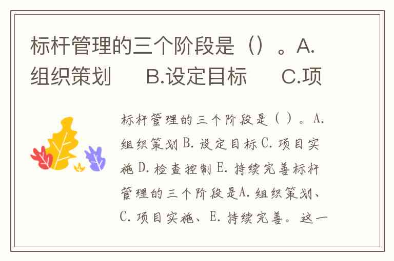 标杆管理的三个阶段是A.组织策划、C.项目实施、E.持续完善。这一经典模型强调系统性改进,通过明确目标、执行措施和长效优化形成管理闭环。