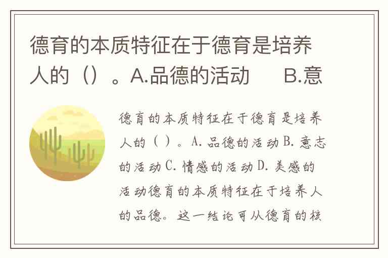 德育的本质特征在于德育是培养人的()。A.品德的活动 B.意志的活动 C.情感的活动 D.美感的活动
