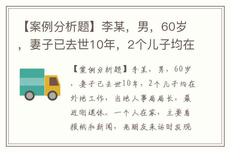 【案例分析题】李某,男,60岁,妻子已去世10年,2个儿子均在外地工作,当地人事局局长,最近刚退休。一个人在家,主要看报纸和新闻,老朋友来访时发现其产生莫名其妙的焦虑感、恐惧感,像小孩一样反复无常。评估方法有哪些?
