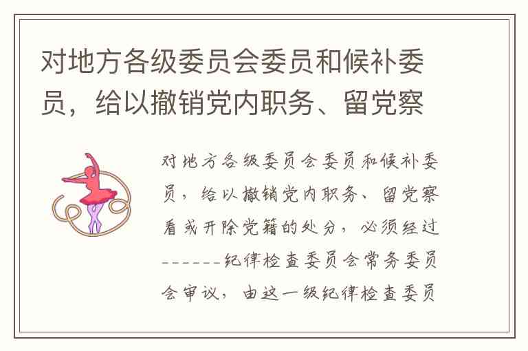 对地方各级委员会委员和候补委员给予撤销党内职务、留党察看或开除党籍的处分,必须经过上级纪律检查委员会常务委员会审议,由这一级纪律检查委员会报同级党的委员会批准。