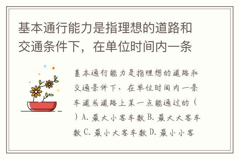 基本通行能力是指理想的道路和交通条件下,在单位时间内一条车道或道路上某一点能通过的()A.最大小客车数 B.最大大客车数 C.最小大客车数 D.最小小客车数
