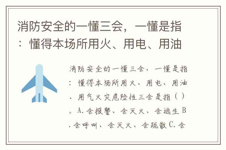 消防安全的一懂三会,一懂是指:懂得本场所用火、用电、用油、用气火灾危险性三会是指()。A.会报警、会灭火、会逃生 B.会呼叫、会灭火、会疏散 C.会报警、会逃生、会疏散 D.会灭火、会疏散、会逃生