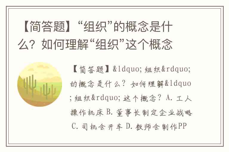 【简答题】“组织”的概念是什么?如何理解“组织”这个概念?A.工人操作机床 B.董事长制定企业战略 C.司机会开车 D.教师会制作PPT E.部门经理懂得处理好上下级关系