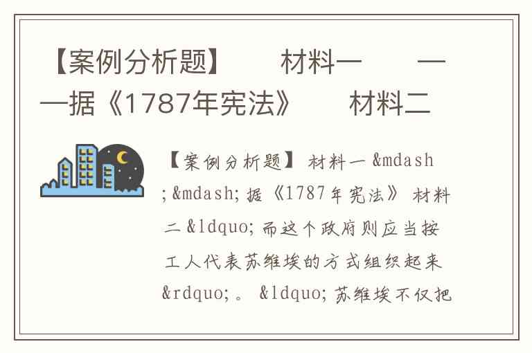 【案例分析题】 材料一 ——据《1787年宪法》 材料二 “而这个政府则应当按工人代表苏维埃的方式组织起来”。 “苏维埃不仅把立法权和对执行法律的监督权集中在自己的手里,而且通过苏维埃全体委员把直接执行法律的职能集中在自己的手里,以便逐步过渡到全体劳动居民人人履行立法和管理国家的职能。” ——摘自《列宁选集》 材料三 “人民行使国家权力的机关是全国人民代表大会和地方各级人民代表大会。” “全国人民代表大会和地方各级人民代表大会都由民主选举产生,对人民负责,受人民监督。 国家行政机关、审判机关、检察机关都由人民代表大会产生,对它负责,受它监督。 中央和地方的国家机构职权的划分,遵循在中央的统一领导下,充分发挥地方的主动性、积极性的原则。” ——摘自1982年《中华人民共和国宪法》 根据材料二并结合所学知识概括苏维埃俄国政体的特点。
