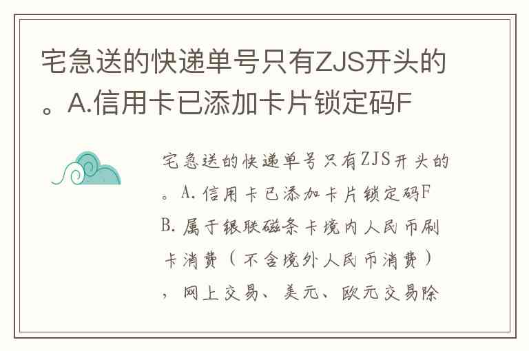 宅急送的快递单号只有ZJS开头的。A.信用卡已添加卡片锁定码F B.属于银联磁条卡境内人民币刷卡消费(不含境外人民币消费),网上交易、美元、欧元交易除外 C.持卡人声明未参与交易的,交易类型为消费及预授权类交易(刷卡类交易) D.发起资金延迟结算请求时间距欺诈交易发生时间不超过3个工作日 E.光大银行卡片在同一商户涉及交易至少满足单笔成功欺诈交易金额≥1万元或单日累计欺诈交易笔数(包含失败交易)≥3笔且单日累计欺诈交易金额(包含失败交易)≥3万元