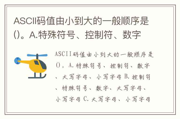 ASCII码值由小到大的一般顺序是()。A.特殊符号、控制符、数字、大写字母、小写字母 B.控制符、特殊符号、数字、大写字母、小写字母 C.大写字母、小写字母、数字、特殊符号、控制符 D.数字、特殊符号、控制符、小写字母、大写字母