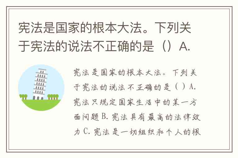 宪法是国家的根本大法。下列关于宪法的说法不正确的是()A.宪法只规定国家生活中的某一方面问题 B.宪法具有最高的法律效力 C.宪法是一切组织和个人的根本活动准则 D.宪法制定和修改的程序和普通法一样严格